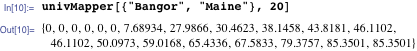 It’s very simple to use Mathematica‘s curated data to get the latitude and longitude for a particular city. For instance, I might want to see where Orono is in relation to Bangor.