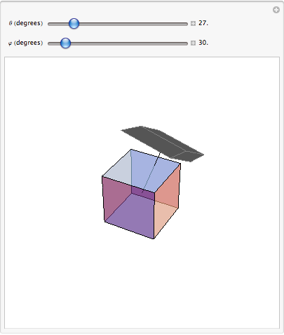 With these utilities in place, I was ready to visualize the projection of the cuboid with edge of length one, whose center of mass is situated at the origin and whose sides are aligned with the coordinate axis. I parametrized the unit normal vector to the projection plane using spherical coordinates θ and φ: {sin(θ) sin(φ),sin(θ) cos(φ),cos(θ)}.