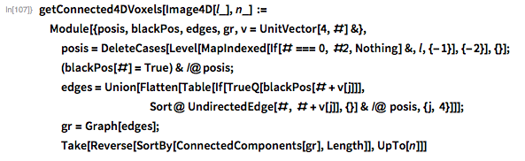 ![getConnected4DVoxels[Image4D[l_], n_] := Module[{posis, blackPos, edges, gr, v = UnitVector[4, #] &}, posis = DeleteCases[ Level[MapIndexed[If[# === 0, #2, Nothing] &, l, {-1}], {-2}], {}]; (blackPos[#] = True) & /@ posis; edges = Union[Flatten[Table[If[TrueQ[blackPos[# + v[j]]], Sort@ UndirectedEdge[#, # + v[j]], {}] & /@ posis, {j, 4}]]]; gr = Graph[edges]; Take[Reverse[SortBy[ConnectedComponents[gr], Length]], UpTo[n]]] getConnected4DVoxels[Image4D[l_], n_] := Module[{posis, blackPos, edges, gr, v = UnitVector[4, #] &}, posis = DeleteCases[ Level[MapIndexed[If[# === 0, #2, Nothing] &, l, {-1}], {-2}], {}]; (blackPos[#] = True) & /@ posis; edges = Union[Flatten[Table[If[TrueQ[blackPos[# + v[j]]], Sort@ UndirectedEdge[#, # + v[j]], {}] & /@ posis, {j, 4}]]]; gr = Graph[edges]; Take[Reverse[SortBy[ConnectedComponents[gr], Length]], UpTo[n]]]](https://content.wolfram.com/sites/39/2017/02/Arpimals-In-107.png)