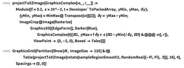 ![GraphicsGrid[Partition[Show[#, ImageSize -> 120] & /@ Table[projectToXZImage[ rotate[sampleRegionSmooth2, RandomReal[{-Pi, Pi}, 3]]], 16], 4], Spacings -> {0, 0}] GraphicsGrid[Partition[Show[#, ImageSize -> 120] & /@ Table[projectToXZImage[ rotate[sampleRegionSmooth2, RandomReal[{-Pi, Pi}, 3]]], 16], 4], Spacings -> {0, 0}]](https://content.wolfram.com/sites/39/2017/02/Arpimals-Out-351-500x657.png)