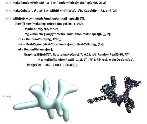 ![SeedRandom[333]; shapes = makeShapes3D[{20, 20, 20}, {7, 1}] SeedRandom[333]; shapes = makeShapes3D[{20, 20, 20}, {7, 1}]](https://content.wolfram.com/sites/39/2017/02/Arpimals-In-11-01.png)