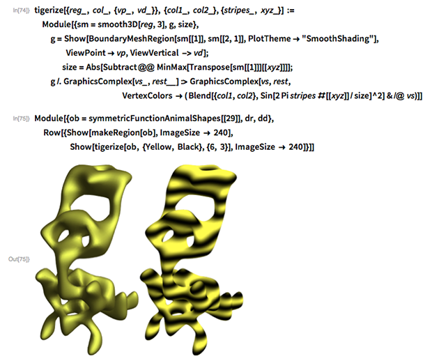 ![tigerize[{reg_, col_, {vp_, vd_}}, {col1_, col2_}, {stripes_, xyz_}] := Module[{sm = smooth3D[reg, 3], g, size}, g = Show[ BoundaryMeshRegion[sm[[1]], sm[[2, 1]], PlotTheme -> "SmoothShading"], ViewPoint -> vp, ViewVertical -> vd]; size = Abs[Subtract @@ MinMax[Transpose[sm[[1]]][[xyz]]]]; g /. GraphicsComplex[vs_, rest__] :> GraphicsComplex[vs, rest, VertexColors -> ( Blend[{col1, col2}, Sin[2 Pi stripes #[[xyz]]/size]^2] & /@ vs tigerize[{reg_, col_, {vp_, vd_}}, {col1_, col2_}, {stripes_, xyz_}] := Module[{sm = smooth3D[reg, 3], g, size}, g = Show[ BoundaryMeshRegion[sm[[1]], sm[[2, 1]], PlotTheme -> "SmoothShading"], ViewPoint -> vp, ViewVertical -> vd]; size = Abs[Subtract @@ MinMax[Transpose[sm[[1]]][[xyz]]]]; g /. GraphicsComplex[vs_, rest__] :> GraphicsComplex[vs, rest, VertexColors -> ( Blend[{col1, col2}, Sin[2 Pi stripes #[[xyz]]/size]^2] & /@ vs](https://content.wolfram.com/sites/39/2017/02/Arpimals-In-74.png)