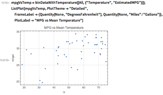 ![mpgVsTemp = binDataWithTemperature[[All, {"Temperature", "EstimatedMPG"}]]; ListPlot[mpgVsTemp, PlotTheme -> "Detailed", FrameLabel -> {Quantity[None, "DegreesFahrenheit"], Quantity[None, "Miles"/"Gallons"]}, PlotLabel -> "MPG vs Mean Temperature"] mpgVsTemp = binDataWithTemperature[[All, {"Temperature", "EstimatedMPG"}]]; ListPlot[mpgVsTemp, PlotTheme -> "Detailed", FrameLabel -> {Quantity[None, "DegreesFahrenheit"], Quantity[None, "Miles"/"Gallons"]}, PlotLabel -> "MPG vs Mean Temperature"]](https://content.wolfram.com/sites/39/2017/06/InOutImg161.png)