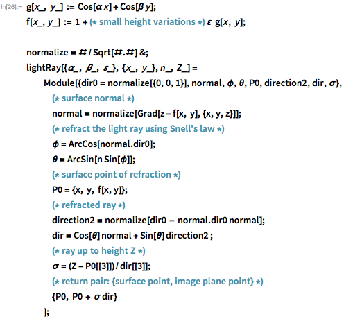 ![g[x_, y_] := Cos[\[Alpha] x] + Cos[\[Beta] y]; f[x_, y_] := 1 +(* small height variations *) \[CurlyEpsilon] g[x, y]; normalize = #/Sqrt[#.#] &; lightRay[{\[Alpha]_, \[Beta]_, \[CurlyEpsilon]_}, {x_, y_}, n_, Z_] = Module[{dir0 = normalize[{0, 0, 1}], normal, \[Phi], \[Theta], P0, direction2, dir, \[Sigma]}, (* surface normal *) normal = normalize[Grad[z - f[x, y], {x, y, z}]]; (* refract the light ray using Snell's law *) \[Phi] = ArcCos[normal.dir0]; \[Theta] = ArcSin[n Sin[\[Phi]]]; (* surface point of refraction *) P0 = {x, y, f[x, y]}; (* refracted ray *) direction2 = normalize[dir0 - normal.dir0 normal]; dir = Cos[\[Theta]] normal + Sin[\[Theta]] direction2 ; (* ray up to height Z *) \[Sigma] = (Z - P0[[3]])/dir[[3]]; (* return pair: {surface point, image plane point} *) {P0, P0 + \[Sigma] dir} ]; g[x_, y_] := Cos[\[Alpha] x] + Cos[\[Beta] y]; f[x_, y_] := 1 +(* small height variations *) \[CurlyEpsilon] g[x, y]; normalize = #/Sqrt[#.#] &; lightRay[{\[Alpha]_, \[Beta]_, \[CurlyEpsilon]_}, {x_, y_}, n_, Z_] = Module[{dir0 = normalize[{0, 0, 1}], normal, \[Phi], \[Theta], P0, direction2, dir, \[Sigma]}, (* surface normal *) normal = normalize[Grad[z - f[x, y], {x, y, z}]]; (* refract the light ray using Snell's law *) \[Phi] = ArcCos[normal.dir0]; \[Theta] = ArcSin[n Sin[\[Phi]]]; (* surface point of refraction *) P0 = {x, y, f[x, y]}; (* refracted ray *) direction2 = normalize[dir0 - normal.dir0 normal]; dir = Cos[\[Theta]] normal + Sin[\[Theta]] direction2 ; (* ray up to height Z *) \[Sigma] = (Z - P0[[3]])/dir[[3]]; (* return pair: {surface point, image plane point} *) {P0, P0 + \[Sigma] dir} ];](https://content.wolfram.com/sites/39/2017/08/InOutImg261.png)