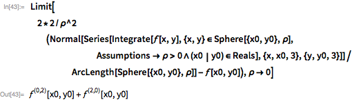 ![Limit[2*2/\[Rho]^2 (Normal[ Series[Integrate[\[ScriptF][x, y], {x, y} \[Element] Sphere[{x0, y0}, \[Rho]], Assumptions -> \[Rho] > 0 \[And] (x0 | y0) \[Element] Reals], {x, x0, 3}, {y, y0, 3}]]/ ArcLength[Sphere[{x0, y0}, \[Rho]]] - \[ScriptF][x0, y0]), \[Rho] -> 0] Limit[2*2/\[Rho]^2 (Normal[ Series[Integrate[\[ScriptF][x, y], {x, y} \[Element] Sphere[{x0, y0}, \[Rho]], Assumptions -> \[Rho] > 0 \[And] (x0 | y0) \[Element] Reals], {x, x0, 3}, {y, y0, 3}]]/ ArcLength[Sphere[{x0, y0}, \[Rho]]] - \[ScriptF][x0, y0]), \[Rho] -> 0]](https://content.wolfram.com/sites/39/2017/08/InOutImg431.png)