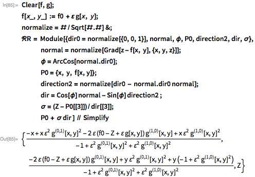 ![Clear[f, g]; f[x_, y_] := f0 + \[CurlyEpsilon] g[x, y]; normalize = #/Sqrt[#.#] &; \[ScriptCapitalR]R = Module[{dir0 = normalize[{0, 0, 1}], normal, \[Phi], P0, direction2, dir, \[Sigma]}, normal = normalize[Grad[z - f[x, y], {x, y, z}]]; \[Phi] = ArcCos[normal.dir0]; P0 = {x, y, f[x, y]}; direction2 = normalize[dir0 - normal.dir0 normal]; dir = Cos[\[Phi]] normal - Sin[\[Phi]] direction2 ; \[Sigma] = (Z - P0[[3]])/dir[[3]]; P0 + \[Sigma] dir ] // Simplify Clear[f, g]; f[x_, y_] := f0 + \[CurlyEpsilon] g[x, y]; normalize = #/Sqrt[#.#] &; \[ScriptCapitalR]R = Module[{dir0 = normalize[{0, 0, 1}], normal, \[Phi], P0, direction2, dir, \[Sigma]}, normal = normalize[Grad[z - f[x, y], {x, y, z}]]; \[Phi] = ArcCos[normal.dir0]; P0 = {x, y, f[x, y]}; direction2 = normalize[dir0 - normal.dir0 normal]; dir = Cos[\[Phi]] normal - Sin[\[Phi]] direction2 ; \[Sigma] = (Z - P0[[3]])/dir[[3]]; P0 + \[Sigma] dir ] // Simplify](https://content.wolfram.com/sites/39/2017/08/InOutImg85.png)