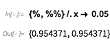 AsymptoticIntegrate[E^(-t)/(1 + x t), {t, 0, Infinity}, {x, 0, 150}]/.{x-> 0.05`20}