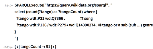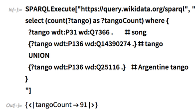 There is another way that those queries could be combined: “Argentine tango” is a “subclass of” (P279) “tango.” Using a property path—a form of triple patterns that allows a regular expression of predicates in its predicate position—we can find songs that are “tango” or in a subclass of “tango” or a subclass of a subclass of… “tango”:
