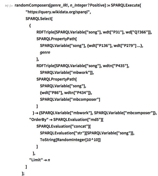 Instead, we’ll use a different approach: ordering by the MD5 hash of the song IRI catenated by a random string. Putting everything together, we arrive at this function, which gives a number of random work-composer pairs for a given genre: