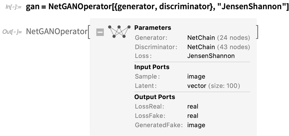 With a generator and a discriminator on hand, we are now ready to combine the two nets using NetGANOperator: