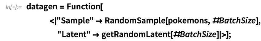 The training of GANs involves being able to infinitely sample random latent values. This can be done by using the generator syntax, as explained in the out-of-core training tutorial, where the third argument of NetTrain is a custom generator function yielding batches of inputs for the training network. For our Pokémon training, the generator function can be written as: