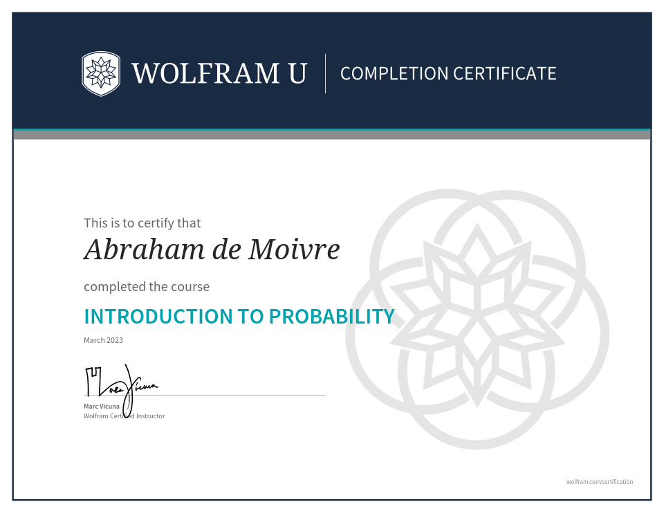 Students who wish to take advantage of everything this course has to offer will, by the time they complete it, have watched all 25 lessons and passed the six quizzes. At this point, students can—and should!—request a certificate of completion showing their proficiency in the field of probability. This certificate can easily be added to your resume or social media profile too!